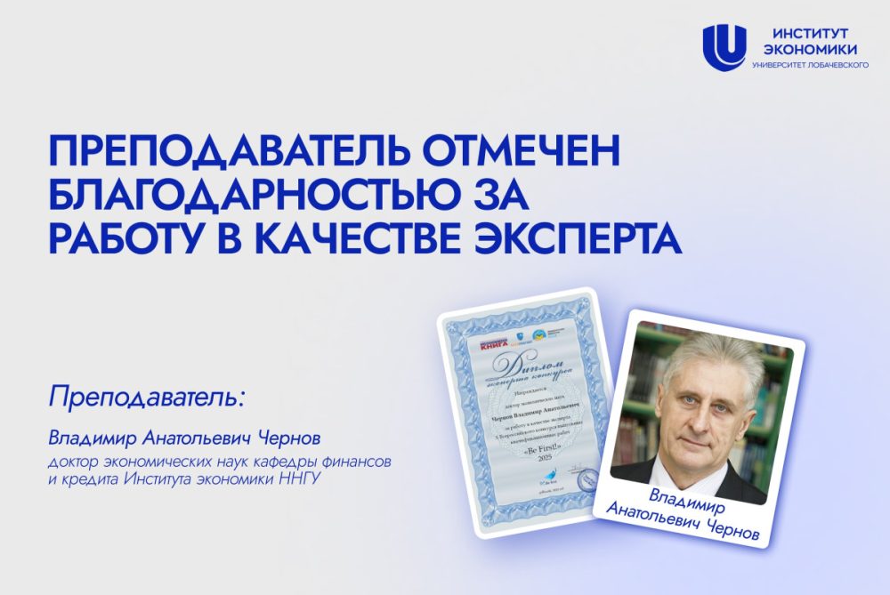 Владимир Анатольевич Чернов, доктор экономических наук кафедры финансов и кредита Института экономики ННГУ, был отмечен благодарностью за работу в качестве эксперта X Всероссийского конкурса выпускных квалификационных работ «Be First!».