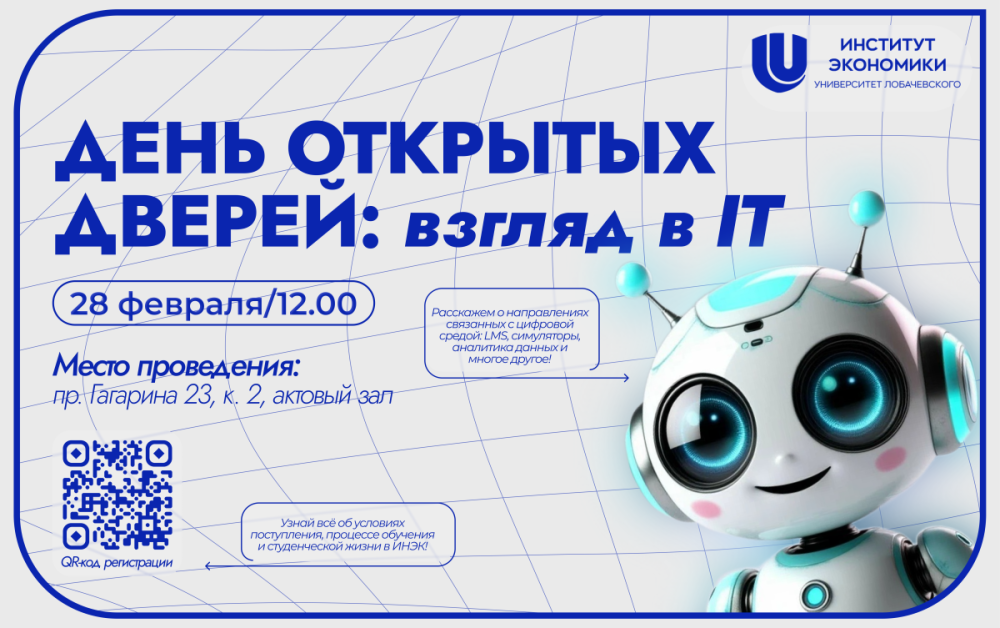 Институт экономики ННГУ им. Н. И. Лобачевского приглашает вас на День открытых дверей , посвящённый приёму на 2026/2027 учебный год. Это ваша возможность узнать всё о программах, условиях поступления и студенческой жизни.