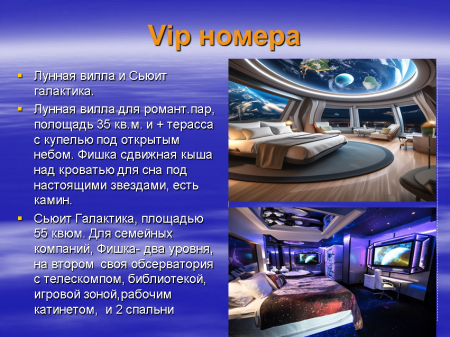 Ребята подошли к задаче с энтузиазмом: презентации получились яркими, оригинальными и детально проработанными. Каждая команда сумела воплотить собственное видение идеального отеля — от дизайна интерьеров до перечня услуг и сценариев досуга.